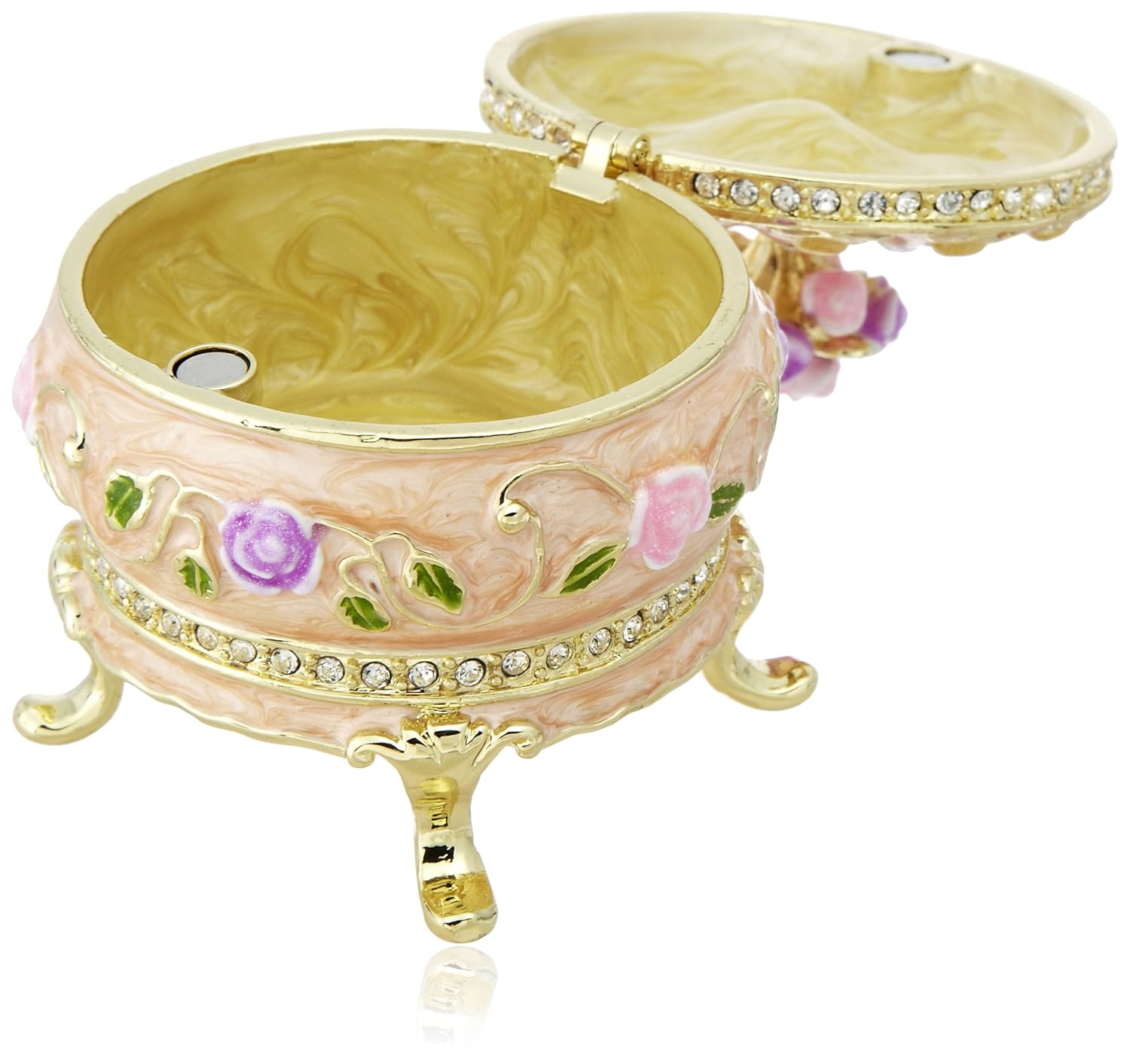 淡いパステルカラーがロマンチックで可憐な雰囲気の小物入れ。お花のモチーフとキラキラ輝くクリスタルがたくさん施され、女性らしさいっぱいのデザインが人気です。ゴールドの猫脚デザインがロマンチックさをより引き立てています。