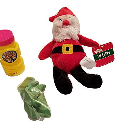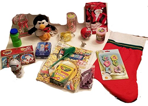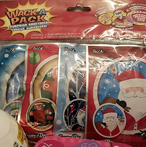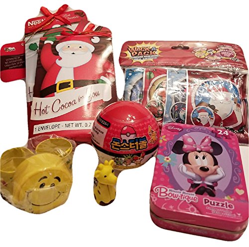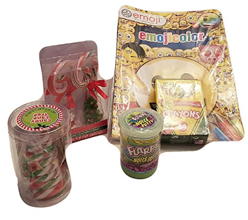 - Each has a wooden puzzle, fun erasures, Emoji coloring Book, crayons, bubbles, small Christmas plush, Flarp noise putty, 2 edible candy cane ornaments,, edible peppermint Christmas tree 2.6oz., 4 wack pack balloons, one surprise ball, 1 small puzzle, 2 pks hot chocolate, a smiley bracelet with candy,, a tin figure ornament, Christmas pencil