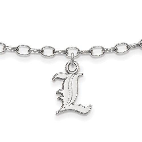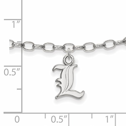 10in long | Product Type:Jewelry | Jewelry Type:Anklets | Chain Type:Cable | Material: Primary:Sterling Silver | Material: Primary - Color:White | Material: Primary - Purity:925 | Length of Item:10 mm | Width of Item:9 mm | Finish:Polished | Plating:Rhodium | Chain Length:9 in | Chain Width:2.5 mm | Charm/Element Length:10 mm | Charm/Element Width:9 mm | Clasp /Connector:Lobster | Licensed By:NCAA | Manufacturing Process:Laser Cut | Licensed Organization:University of LouisvilleFeature