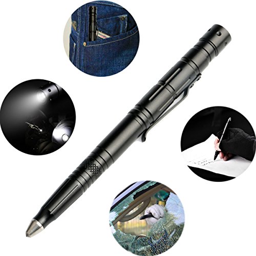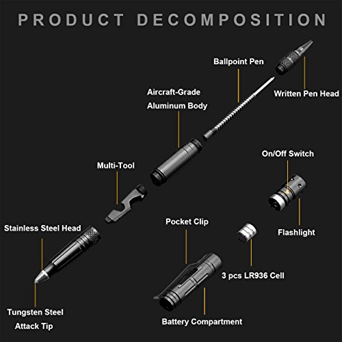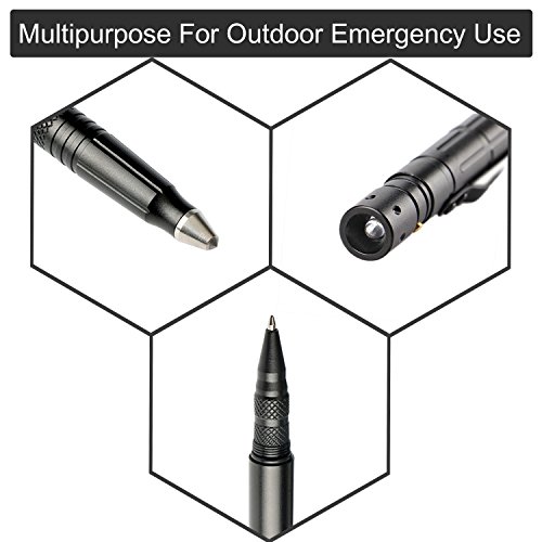 -. Feature : 【Multipurpose Tactical Pen】This is a 4 in 1 high quality aluminum alloy tactical , including Tungsten Steel Tip Glass Breaker/ LED Flashlight/ Metal Black Ink Ball Pen/ Bottle Opener with flat head screwdriver. / 【Emergency Survival Tool】12 Lumen LED Flashlight can be reliable outdoor lighting for hunters, hikers and campers, battery life is up to 10 hours; Built-in tungsten steel tip glass breaker is available for escaping from cars in emergency or protect yourself. / 【Practical Commen Use Tool】Screw off the cap of pen, you can get a dismountable a useful multipurpose tool, including bottle opener, flat head mini-screwdriver and serrated edge. / 【Nice Business Pen】 Meanwhile it is a pocket ballpoint pen that is well suited for carrying around, hooking onto backpack, briefcase and shirt pocket. (Black ink) / 【Wide Application】Useful EDC for tactical pen collector, outdoorsmand, car owners, and a must have for outdoor travel.