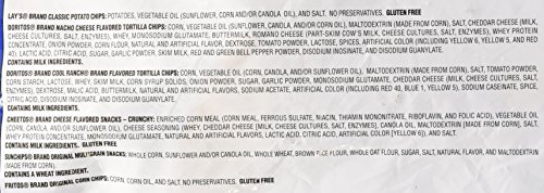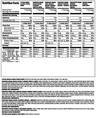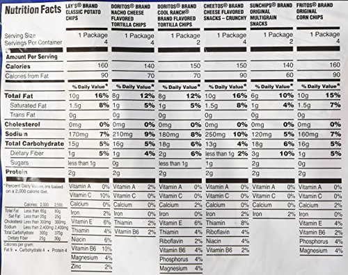 -. Feature : Variety pack of Frito-Lay favorites in one convenient package / With six different varieties, there's sure to be something everyone will love / 20 Count Mix includes 4- LAY'S Classic Potato Chips, 4- DORITOS Nacho Cheese Flavored Tortilla Chips, 2- DORITOS COOL RANCH Flavored Tortilla Chips, 4- CHEETOS Crunchy Cheese Snacks, 2- SUNCHIPS Original Multigrain Sancks , and 4- FRITOS Original Corn Chips / Easy to carry, easy to store, and easy to pack / MAKE EVERY DAY A FUNDAY