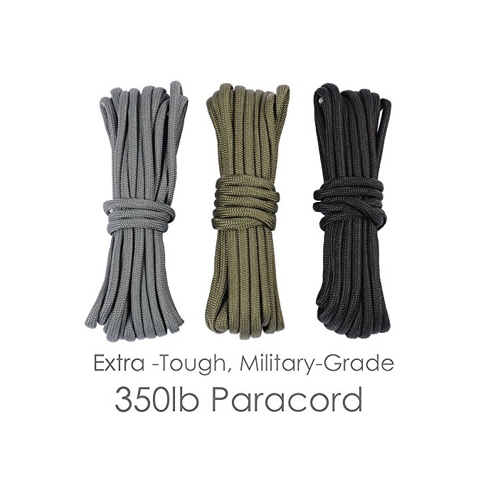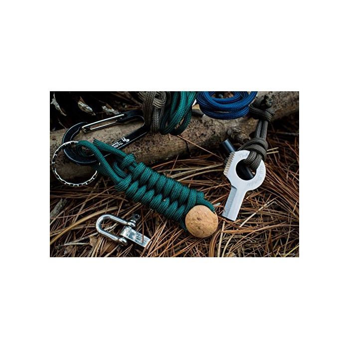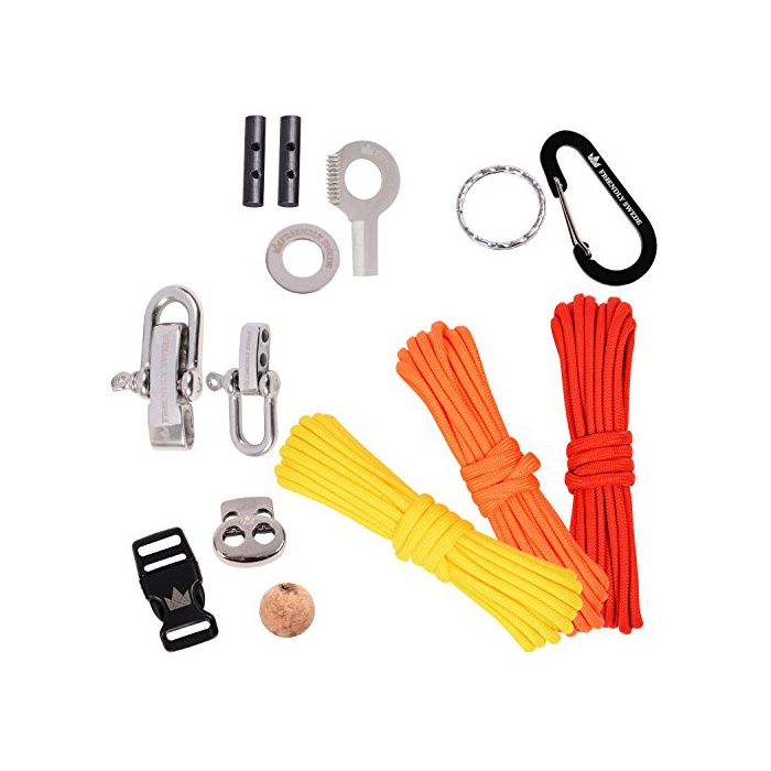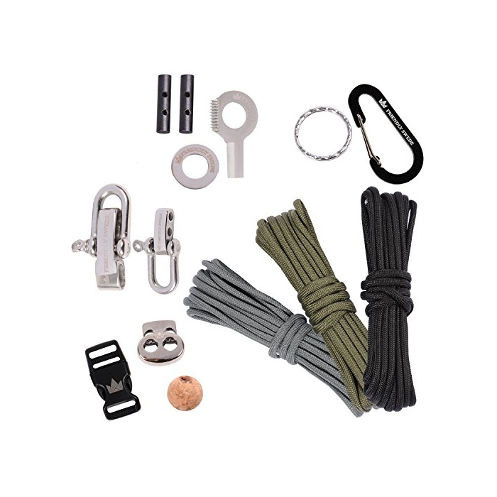 충실한 키트:당상품에는 길이 약3.6m,내가중 양550lb (약249kg)의 고품질 파라 코드3개와 10종류의 악세사리가 부속합니다:메탈 shackle (대)고, 메탈 shackle (소)고, 퀵 릴리즈 버클,카라비너,부싯돌로 불을 일으킴용 나이프,부싯돌로 불을 일으킴용 링,부싯돌로 불을 일으킴 로드2개,금속제 토글,키홀더 링,코르크 볼.