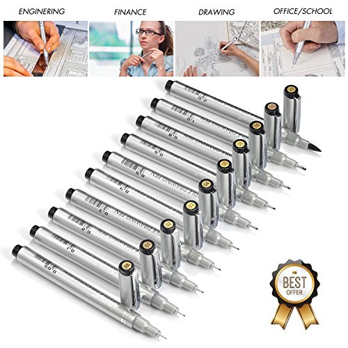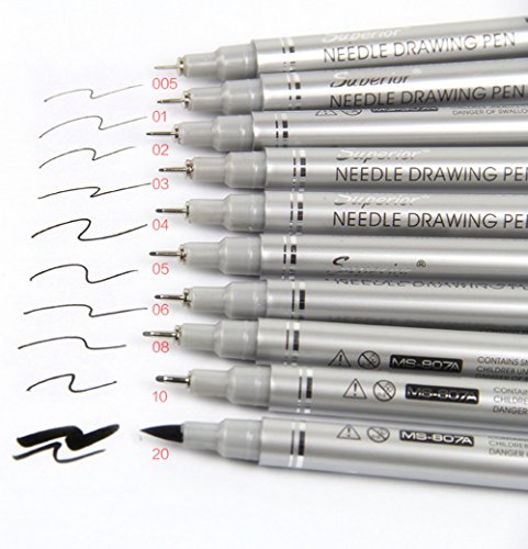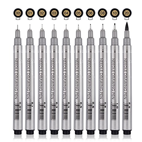 - A Must Have Set - Set of 10 Pcs micro-pens with different types of tips,0.2mm (005), 0.25mm (01), 0.3mm (02), 0.35mm (03), 0.4mm(04), 0.45mm (05), 0.5mm (06), 0.6mm (08), 1.0mm (10), 2.5mm (20) .No matter thin or thick,no matter what kind of line you need,this set solves all your problems.Set with a brush tip pen for your special use.