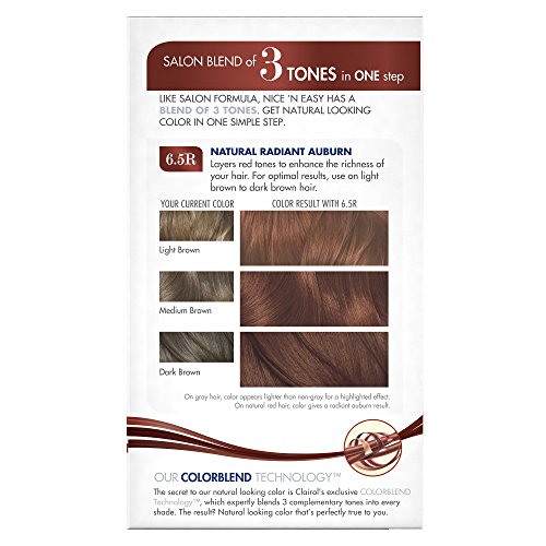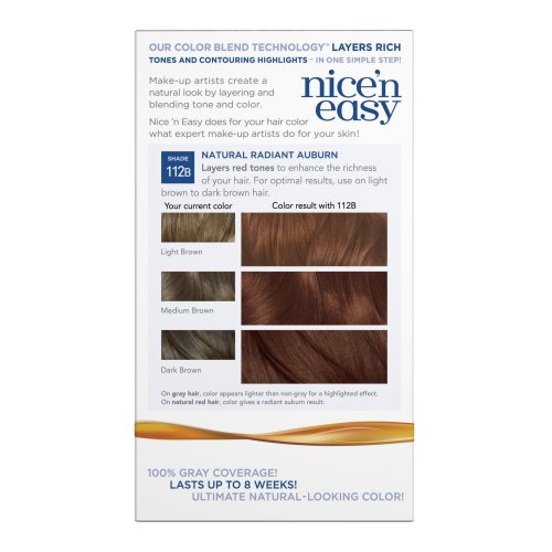 -. Binding : Health and Beauty -. Brand : Clairol -. Color : Auburn -. Feature : Superior natural looking color with tones and highlights / Lasts up to 8 weeks. / 100% gray coverage. / Permanent color. Available in Blonde, Brunette, Black and Red shades. / CC Colorseal Conditioner adds intense shine, helps lock in natural looking color and protects hair between coloring. -. Label : Clairol -. Manufacturer : Clairol -. MPN : na -. NumberOfItems : 12 -. PackageQuantity : 12 -. PartNumber : na -. ProductGroup : Beauty -. ProductTypeName : BEAUTY -. Publisher : Clairol -. ReleaseDate : 2012-11-16 -. Studio : Clairol -. Title : Clairol Nice 'N Easy Hair Color 112 B Natural Radiant Auburn 1 Kit (Pack of 12)