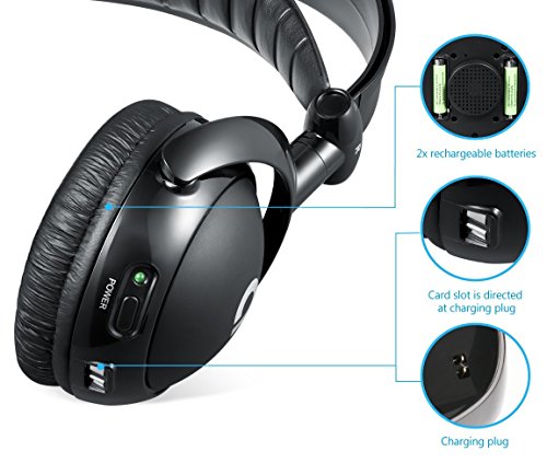 Wireless transmitter is also the headphones' charging dock, two rechargeable batteries are also supplied; install batteries before use and direct headphones card slot at charging plug in the charging dock when charging; 6 hours of charging time provide 12-hour use