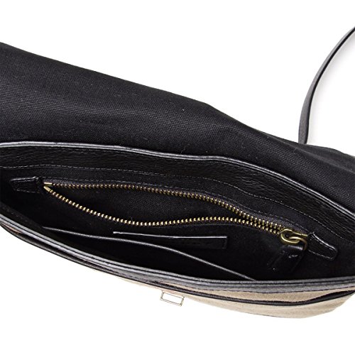 -. Feature : Flap push-lock closure. / Exterior slip pocket. / Interior zip and slip pockets. / Canvas/jute with leather trim. / 30 x 4 x 26cm/11.8 x 1.6 x 10.2in