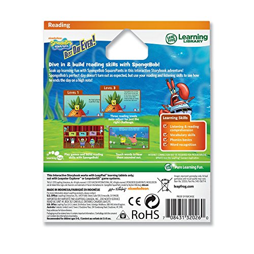Designed by in-house educational experts, LeapFrog Ultra eBooks are grounded in the latest research for the richest possible learning experience. As leaders in educational entertainment, LeapFrog combines innovation with a breadth of play patterns to delight and expand learning horizons. SpongeBob SquarePants Best Day Ever! Ultra eBook asks readers to demonstrate an understanding of the story in comprehension activities and to practice word recognition skills in word-based activities.