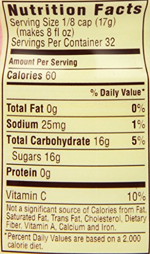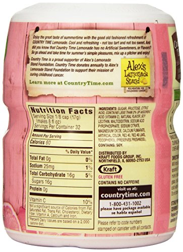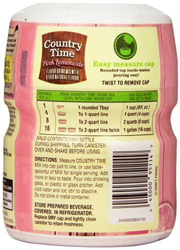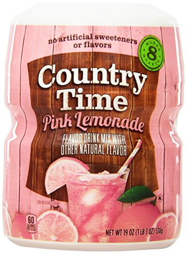 Flavor drink mix with other natural flavor. Less sugar than soda. 40% less than leading sodas. Makes 8 quarts. Enjoy the great taste of summertime with country time pink lemonade. Cold and refreshing - not too tart and not too sweet. And did you know that country time pink lemonade has 40% less sugar than the leading regular sodas? that's right, the good old fashioned country time you know has less sugar than you thought! so go ahead and take time for summer's pleasures, mix up a pitcher and enjoy! this product contains 16 grams of sugar per serving compared to 27 grams of sugar in leading regular sodas. Contains no caffeine.