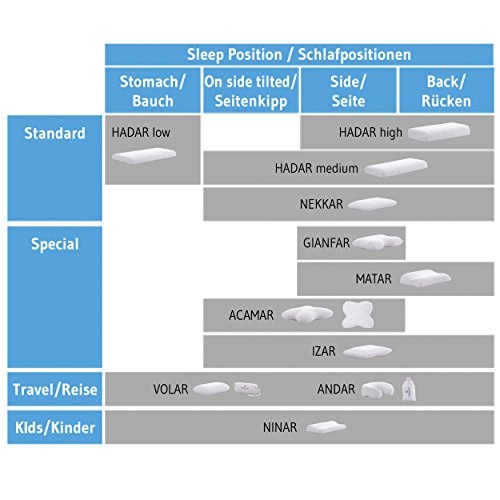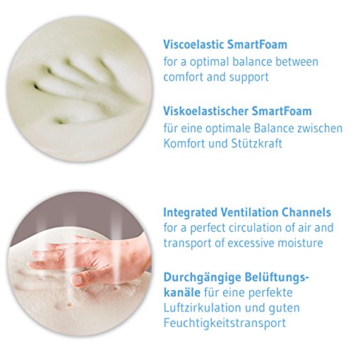 -. Feature : Perfektes SEITEN-, SEITENKIPP- UND RÜCKENSCHLÄFER-KISSEN: Morgens nicht ausgeschlafen und 100% fit? Häufig ist das falsche Kissen die Ursache schlechten Schlafs. Das NINAR ist das optimale Kopfkissen für KINDER ab 5 Jahren oder Erwachsene, die auf WASSERBETTEN und in der Seiten-, Seitenkipp- oder Rückenlage schlafen. Dank der orthopädischen NACKENWELLE passt sich das ergonomische Visco-Kissen diesen Schlafpositionen ideal an. / ERGONOMISCH und ORTHOPÄDISCH: Gemeinsam mit Schlafexperten haben wir das thermoregulierende SMARTFOAM-Kissen NINAR entwickelt. Unser Kissen bietet optimale Stützkraft für Nacken und Halswirbelsäule (HWS) und maximalen Komfort, wodurch Rücken- und Nackenschmerzen sowie Verspannungen verhindert werden. Erleben Sie ein unvergleichliches SCHLAFERLEBNIS und maximale ERHOLUNG, während Sie schlafen. / Optimales WÄRME- & FEUCHTIGKEITSMANAGEMENT: Thermoregulierende Mikrokapseln im speziellen THERMIC-BEZUG, sowie die in das Kissen eingearbeiteten VENTILATIONSKANÄLE, sorgen für eine OPTIMALE BELÜFTUNG, ein ideales Temperaturmanagement und halten Sie in einem gesunden Mikroklima während des Schlafes. Mit dem NINAR werden Sie und Ihr Kind nachts weniger Schwitzen und Frieren und somit ruhiger schlafen können. / BESTE QUALITÄT: Wir verwenden ausschließlich qualitativ hochwertiges Material für unsere Visco Kopfkissen. Bezug: 65% Polyester, 35% Viscose (Thermic Inside) // Kern: 100% Viscoelastischer Memory Schaum. Das NINAR kommt in praktischer Aufbewahrungstasche: Lässt sich überall hin mitnehmen und sauber verstauen.