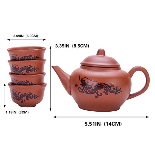 -. Feature : 5-pcs purple clay tea set (1pc Teapot and 4 pcs Teacup) / Capture the spirit of sleek and simple Asian design with our oriental-inspired teacups / Glazed purple clay retains the heat / Comes in gift box for any occasion / Dimensions Aprrox: Teapot: L5.5" x D3.5" x H3.5", Cups: Diameter 2.1" x H1.2"