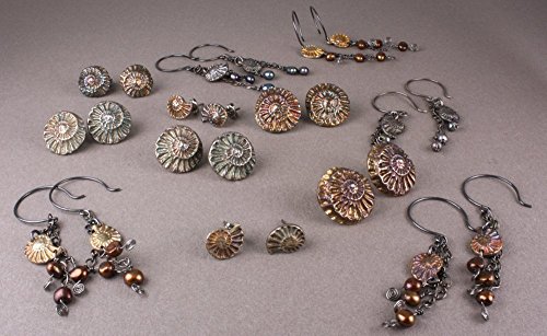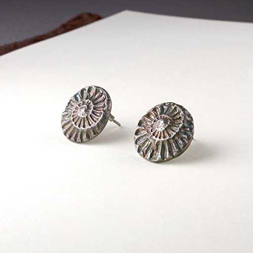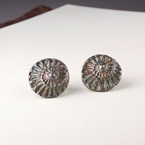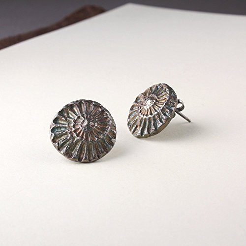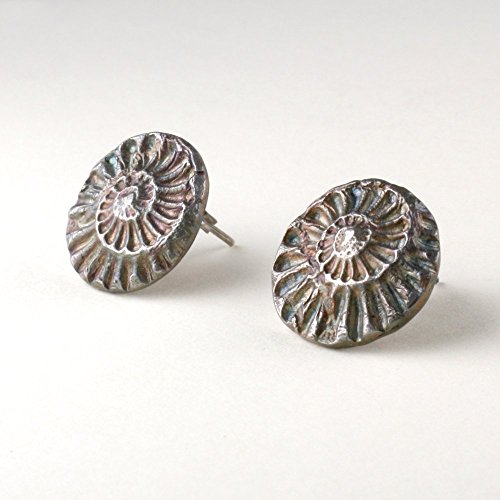 -. Title : Ammonite Stud Earring, Sterling, 15mm Size, Iridescent Patina