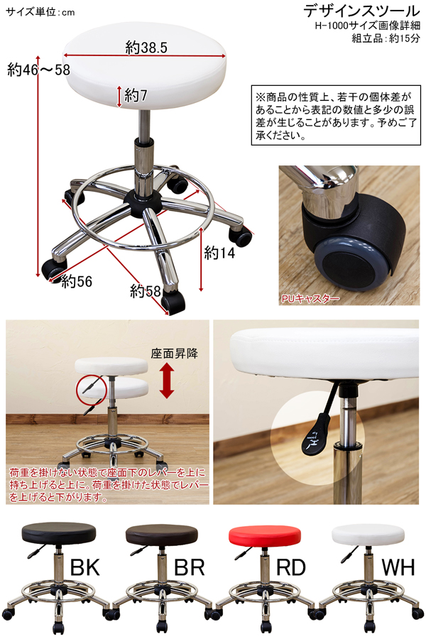 本商品はお取り寄せ商品のため、稀にご注文入れ違い等により欠品・遅延となる場合がございます。誠に恐れ入りますが、何卒ご了承ください。 また、以下の場合には追加送料がかかる場合がございます。  ・大型商品の複数購入時 ・同梱区分が異なる商品の複数購入時  【出荷目安】:1 - 4営業日 ※土日・祝除く 【同梱区分】:TS 1490 【梱包サイズ】:大型商品 【代引き決済】:不可  配送伝票の依頼主は出荷元(メーカーもしくは仕入元)名となる場合がございますので、お受け取りの際はご注意ください。   【型番】H1000  【商品名の色やサイズについて】 こちらは「デザインスツール(円形スツール/ロースツール) 張り地:合成皮革/合皮 座面昇降式 キャスター付き レッド(赤)」の商品ページです。商品画像や商品情報には、色違いやサイズ違いの商品が載っている場合がございます。ご注文前に色・サイズ・セット内容のご確認をお願いいたします。  デザインスツールです  座面厚約7cm、ふっくらした座り心地です 座りながら移動できて便利です レバー操作で昇降出来ます  ブラック(BK)、ブラウン(BR)、レッド(RD)、ホワイト(WH)の4色展開です  幅580(キャスター含む)×奥行560(キャスター含む)×高さ460~580mm(梱包サイズ:幅550×奥行525×高さ150mm) 本体重量:5.2kg(梱包重量:6.2kg) 組立式(約15分/付属の工具にて組立)1個口 張り地:合成皮革(PU)、内材:ウレタンフォーム フレーム:スチール(クロームメッキ) PUキャスター  原産国:中国  【ご注意事項】 ※本商品は、北海道・沖縄・離島への配送はいたしかねます。あらかじめご了承ください。