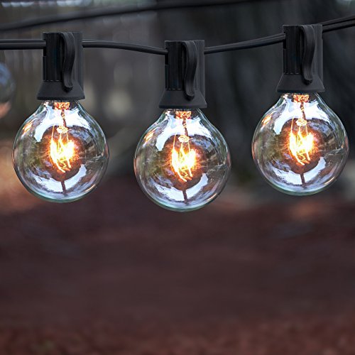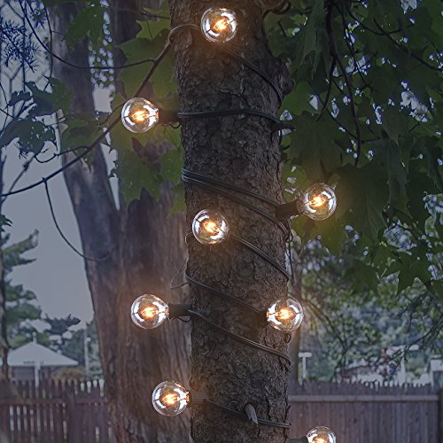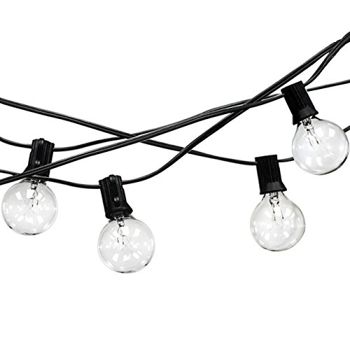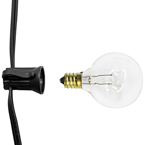 - DESIGN FEATURES—Includes 25 energy-efficient clear bulbs designed on a heavy duty cable wire— UL Listed Power Supply—Bulb & Socket Type: G40 w/ a C7 / E12 base— Directly plug in and unplug to power on and off—Bulbs are 40 mm or 1.5 inches in diameter —Bulb spacing is 12 inches—Total String Length (end to end) measures approximately 25 ft