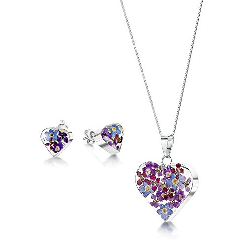 Shrieking Violet Ltd Silberschmuck mit echten Blumen: Herz-Anhanger - blaue & lila Vergissmeinnicht - mit 45cm Silberkette