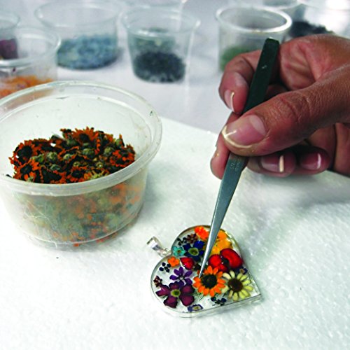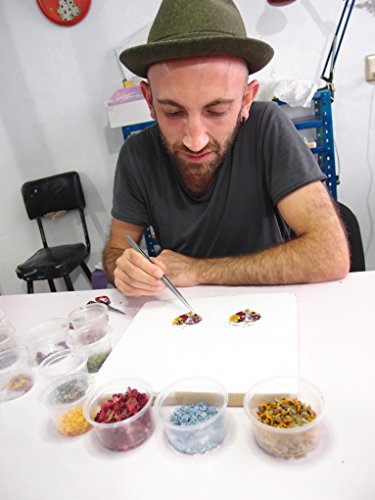Jedes Schmuckstuck wird individuell von Hand gefertigt. Die eingebetten Blumen variieren in Grosse, Form und Farbe.