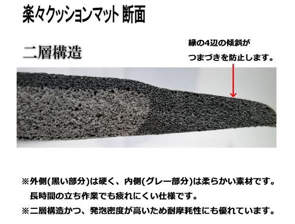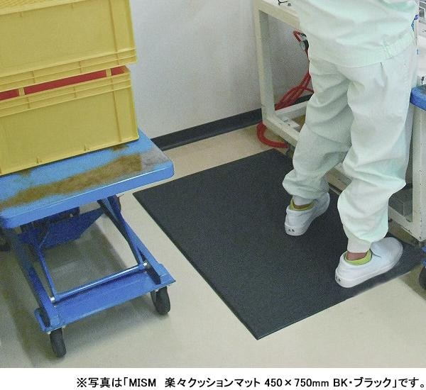 | 厚さ12.5mmのクッション材で、床からの反発力を減らし、体重を分散・吸収!!長時間の立ち仕事でも身体に負担をかけにくくします。二層構造かつ、発泡密度が高いため耐摩耗性に優れています。また、表面の波状の突起で靴が滑りにくくなっています。無数の気泡に含まれる空気は床面からの冷気も防ぎます。マット縁の4辺には台車使用時や躓き防止の傾斜付きです。 |
