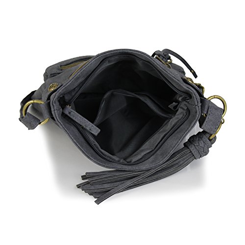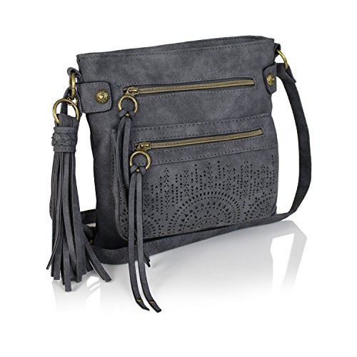 Charcoal Bohemian Laser Cut Faux Suede Perforated Crossbody Bag with Large Tassel