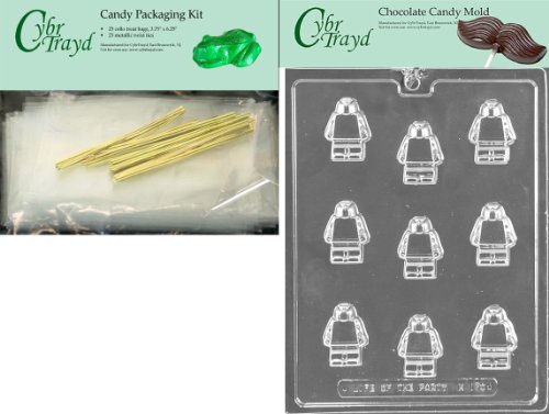 Cybrtrayd Mdk25G-K170 Building Block Man Chocolate Candy Mold with Packaging Bundle, Includes 25 Cello Bags and 25 Gold Twist Ties
