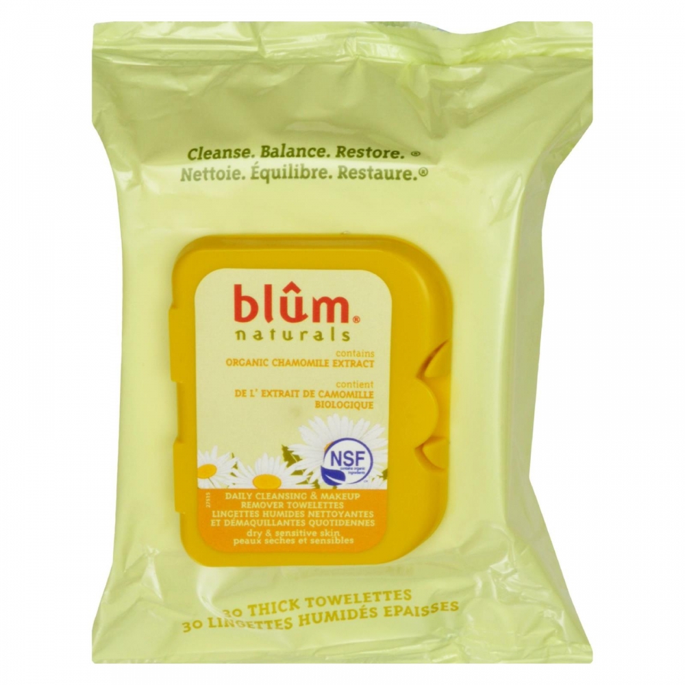 | Blum Naturals Dry and Sensitive Skin Daily Cleansing Towelettes with Chamomile Description: Cleanse. Balance. Restore. Contains Organic Chamomile Extract Made With Natural and Certified Organic Ingredients Paraben Free pH Balanced Hypoallergenic Blum Naturals Dry/Sensitive towelettes are infused with natural and organic botanicals that gently remove eye and face make-up. These soft towelettes gently cleanse and rehydrate for healthy looking skin.