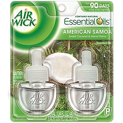 Studio : Air Wick Publisher : Air Wick Product Description Enhance your home's scent story with Air Wick American Samoa Ofu Island Sweet Coconut and Island Palms Scented Oil. Explore the lush paradise of American Samoa to finally reach the sweet refreshing notes of native coconut and island palms. Contains natural essential oils. Each Air Wick refill provides up to 45 days of continuously diffused and carefully blended fragrance throughout your home, office, or any space. Air Wick Scented Oil Warmers also allow you to choose between 5 fragrance levels as desired, while enhancing your decor with a sleek look. Based on low setting. 0