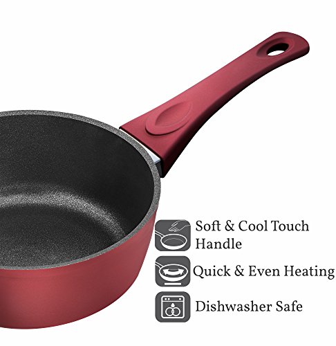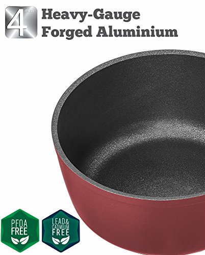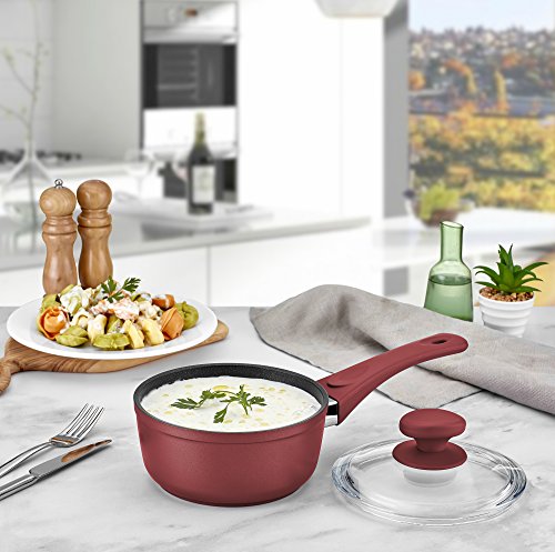 This 4mm forged aluminum sauce pan delivers the fastest heat-up times that you want with the even heating that you need. Most low-quality aluminum pans are less than 2.5mm thick. Because aluminum is a durable, lightweight metal, Saflon’s thicker pans provide unmatched results without adding noticeable weight. High quality tempered glass lid is durable than regular glass lids and gives you to opportunity observe your food while cooking.