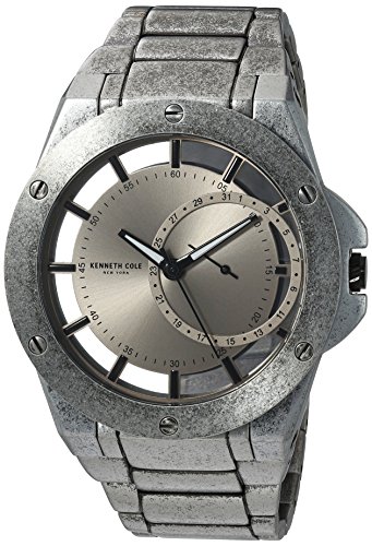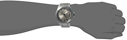 Antique silver-tone stainless steel case and band. Light grey dial with transparent detail. Quartz movement. Date. Water resistant 30 meters. Case 46 mm.