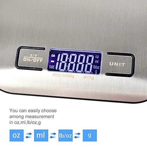 STree Digital Multifunction Food Kitchen Scale, 11lb 5kg, Stainless Steel Platform, Silver (Batteries Included)