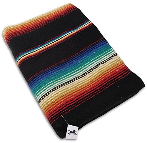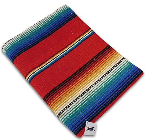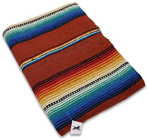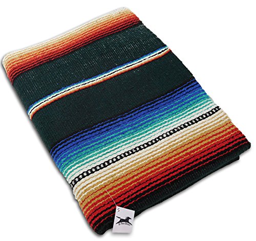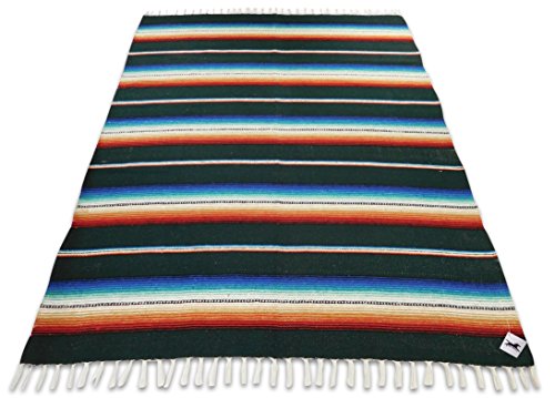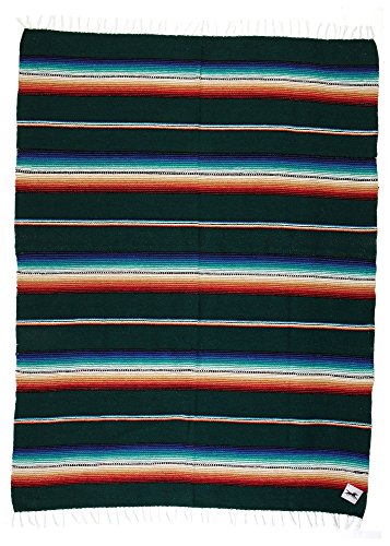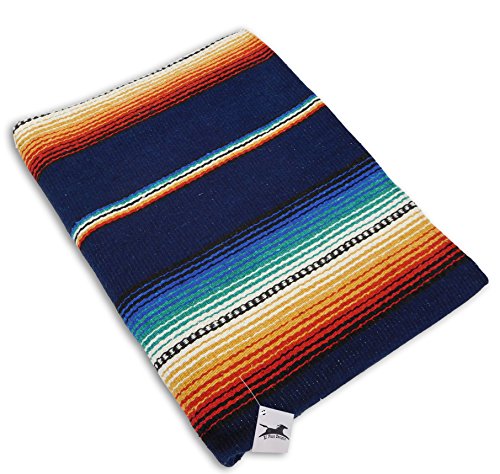 Beautiful hand woven falsa blanket designed with classic serape stripe pattern. Features white tassels on ends of blanket. Hand crafted from heavy acrylic yarn. Measures 57 in x 74 in. Weighs 3.4 pounds. Machine wash gentle in cold. Hang to dry.