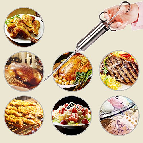 - 2 Needles for Liquids and Solids: a liquid marinade needle and a minced marinade needle included. Large Slant Needle to inject large spices such as peppercorns, and Needle with multiple side holes for liquid sauce like marinades or brine.