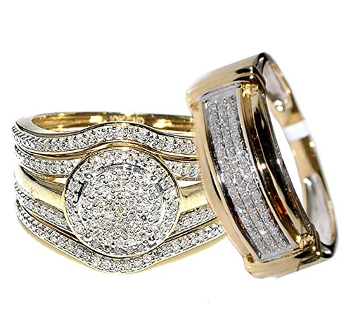 -. Binding : Jewelry -. Brand : Midwest Jewellery -. Department : womens -. Feature : Stunning 4 Piece Wedding Rings Set 3 for Women 1 for Men / Wide Mens Wedding band 9mm in 10K Yellow Gold / 10mm Wide Ladies Bridal Set with two matching ladies bands / Fine Rings Collection By MidwestJewellery / Rings Available in standard Size 7 for women and 10 for men -. ProductGroup : Jewelry -. ProductTypeName : FASHIONRING -. Title : Rings-MidwestJewellery.com 4-Piece 10K Yellow Gold 0.66carats Diamonds 19mm Wide Halo Style His and Her Bridal Trio Rings Set (I-J Color, I2-I3 Clarity)