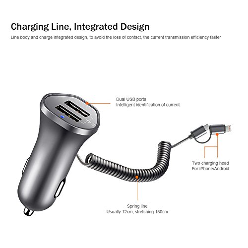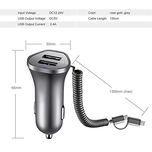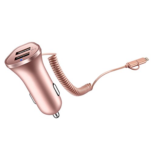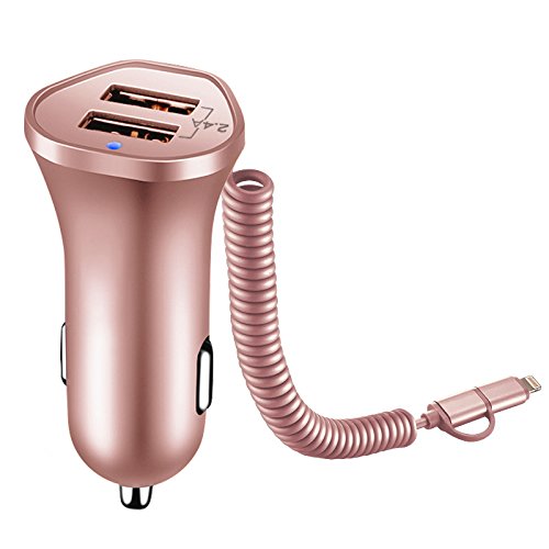2-Port USB Car Charger 2.4A Quick Charge with 2 in 1 Cable Length 4.2ft.for Galaxy S7/S6/Edge/Plus,Note 5/4,iPhone 7/6s/Plus,iPad etc.- Rose Gold