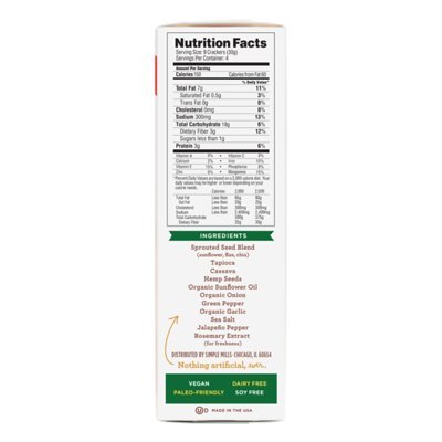 -. Feature : Spice things up! Jalapeño Sprouted Seed Crackers deliver the kick you've been waiting for. / Made with plant powered, nutrient-dense ingredients / High bio-availability sprouted seed blend / Free of Gluten, Grains, Soy, Corn, Dairy & Gums/lsifiers / High in ALA Omega-3s & a good source of Vitamin E and Manganese
