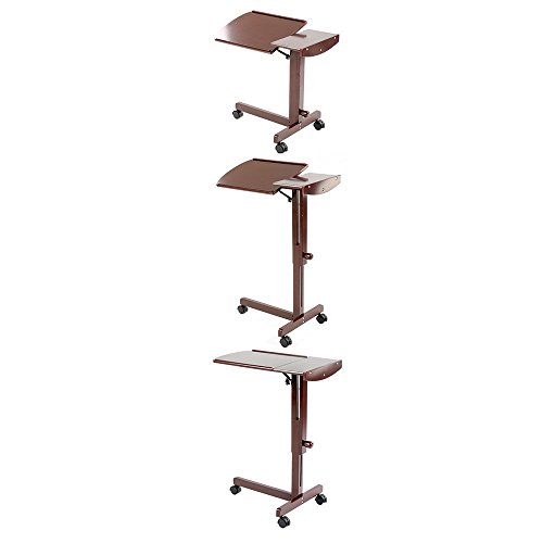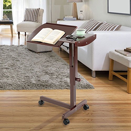 -. Feature : Perfect for your laptop Rolls from room to room / Tabletop tilts in either direction and raised edges keep laptop, tablet, book, magazine or newspaper at the perfect angle / Side stationary table keeps a beverage, snack, eyeglasses or remote controls handy / L-shaped base glides easily under your couch, bed or favorite chair-or use while standing up / Stylish walnut color compliments any decor