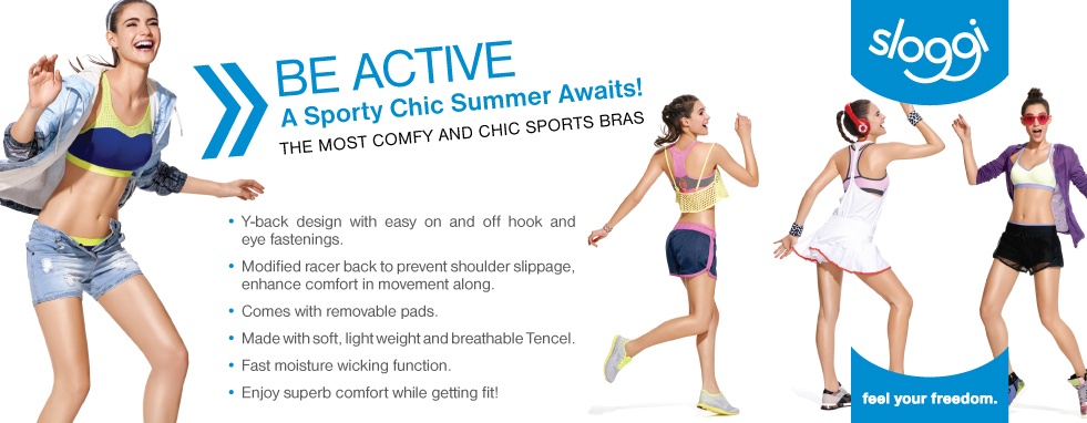 sloggi's ACTIVE collection features tops and bottoms made of breathable, quick dry material, designed with fun and bright contrasting colour combinations that are fit for fashion and fun.