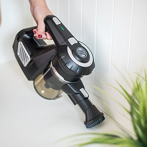 The SilverOnyx X9 Cordless Handheld Vacuum features 2-speed control (by toggling the power button), a powerful mother that provides 7 kPa of suction, and a 2200 mAh lithium battery that provides up to 45 minutes of run time. The bagless cyclonic cleaning action filters event he smallest dust and pet hair particles through a HEPA filter and deposits debris into a convenient canister for easy car and home cleaning.