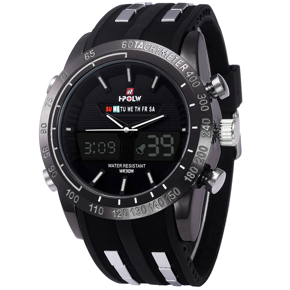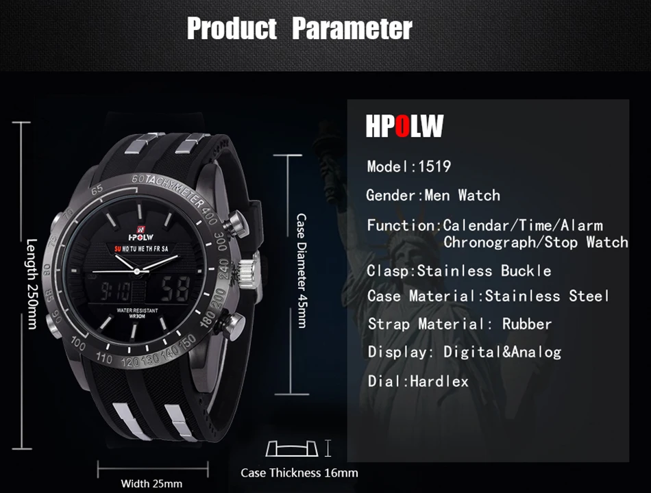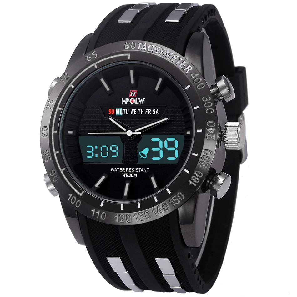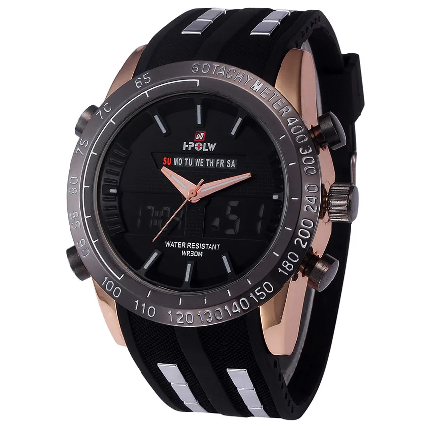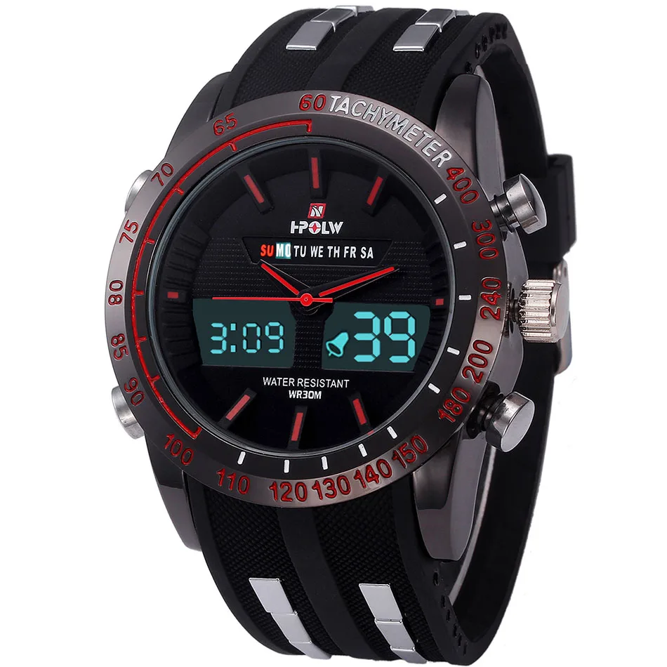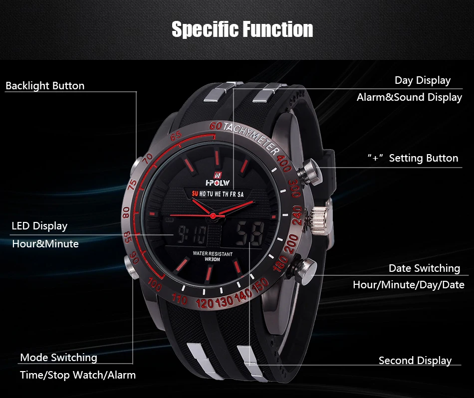 Feature:LED display,Stop Watch,Back Light,Shock Resistant,Chronograph,Auto Date,Alarm,Swim,Repeater