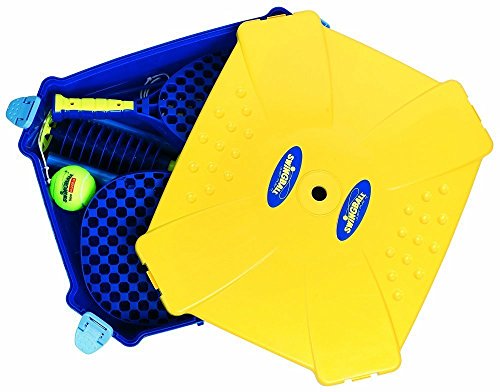 We love this unique and portable All Surface Swingball game. Empty the case and fill with water, gravel or other ballast. Close lid, insert game poles and you're ready to play on any surface- grass, concrete, even sand. For two-person play, use the large checker bat paddles to hit the tethered tennis ball back and forth. Or bat the ball around the pole for one person or practice play. Pole stands approximately 6' tall assembled. All components store in game case. Paddle colors may get vary.