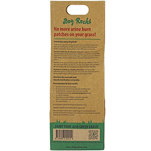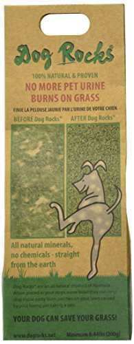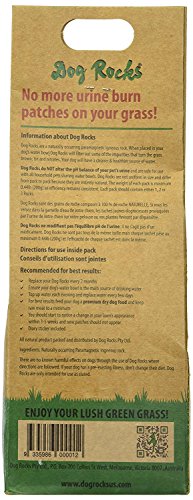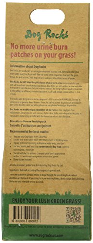 Studio : Dog Rocks Publisher : Dog Rocks Binding : Misc. Product Description Dog Rocks are a 100% Natural Australian product that will save your lawn from those nasty burn patches that your dog's urine can cause. Dog Rocks filter out impurities from water such as Tin, ammonia and nitrates. These impurities are usually passed out through urine, and when grass comes in contact with these elements it results in urine burn on grass, resulting in a dead, yellow patch on your lawn. Dog Rocks give your four legged friend a cleaner source of water, while eliminating urine burn on grass this will result in the stop of those nasty burnt yellow patches on your lawn. Without the impurities in the water, Dog Rocks actually help your dog fertilize your lawn! This is great for you, your dog your lawn! 0