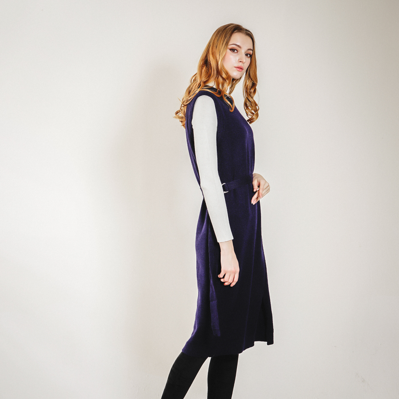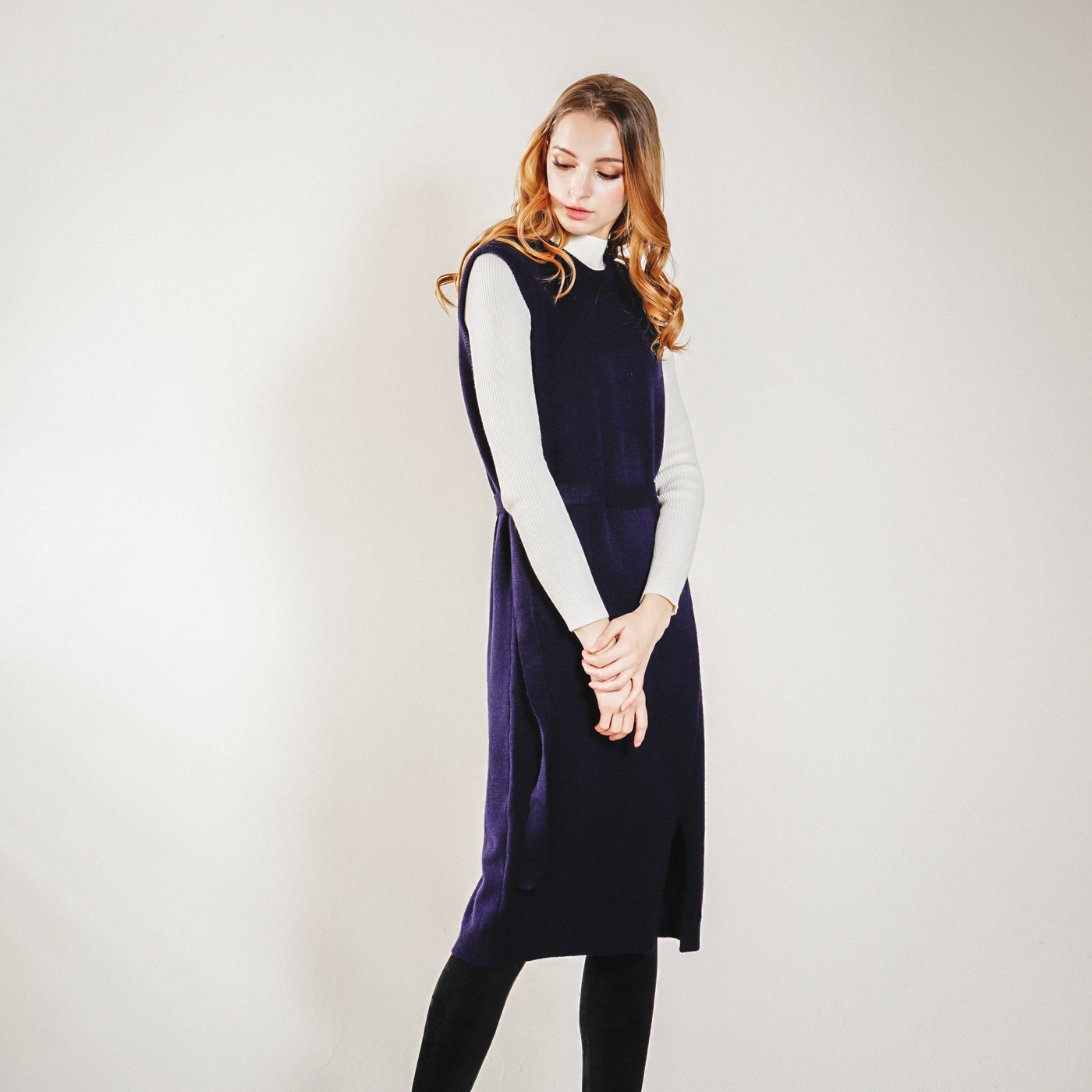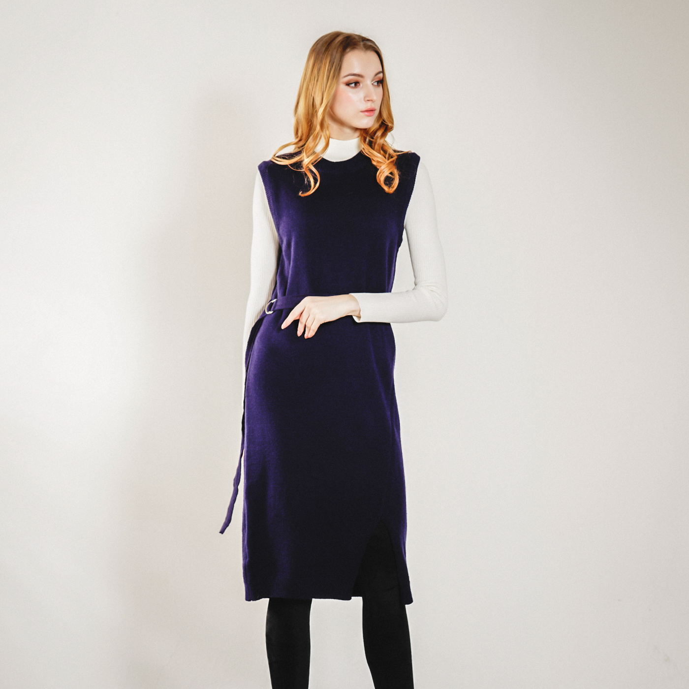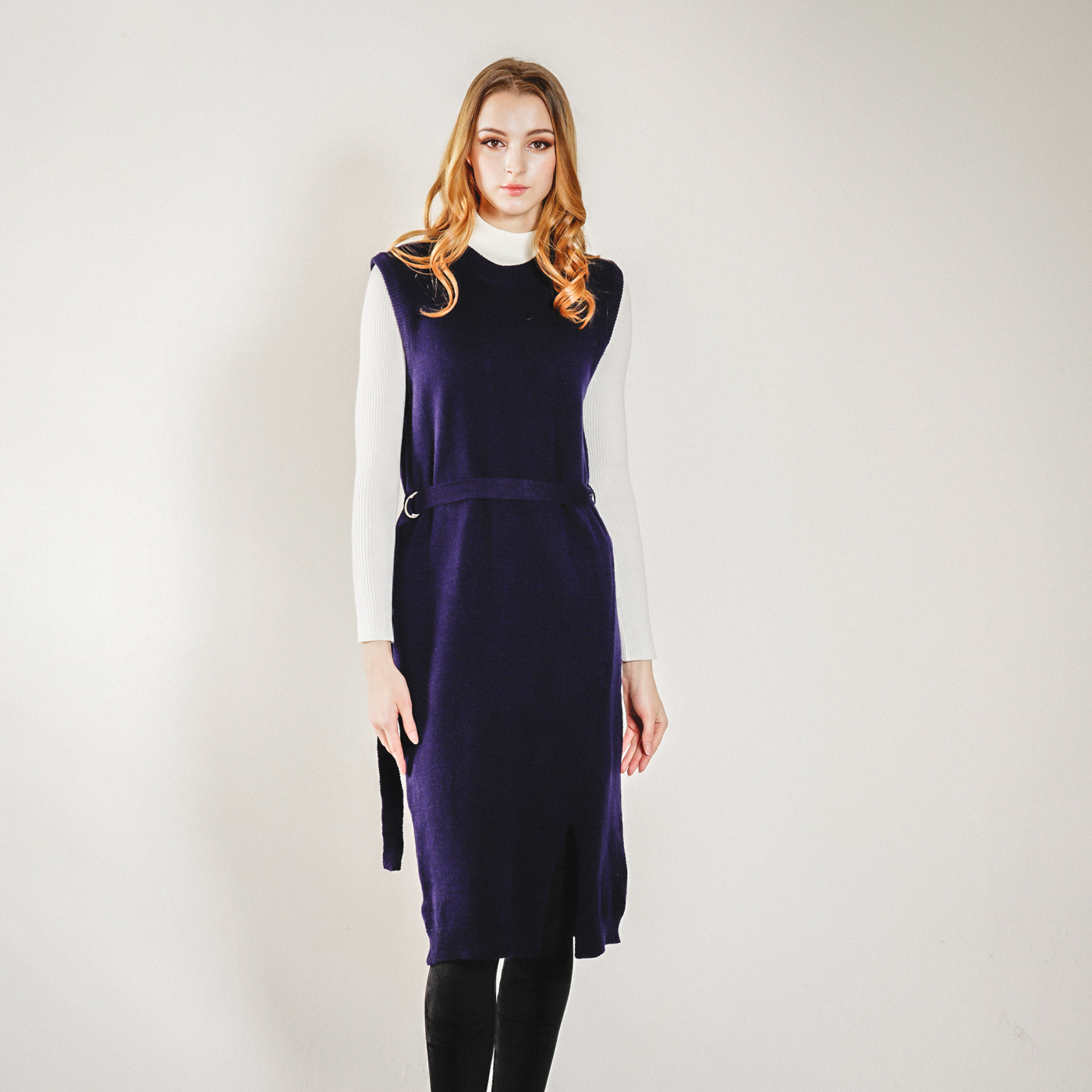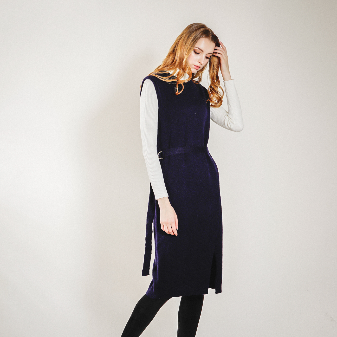 롱기장의 시크한 벨트 포인트의 니트 원피스입니다. 베스트로 코디하셔도 좋습니다.