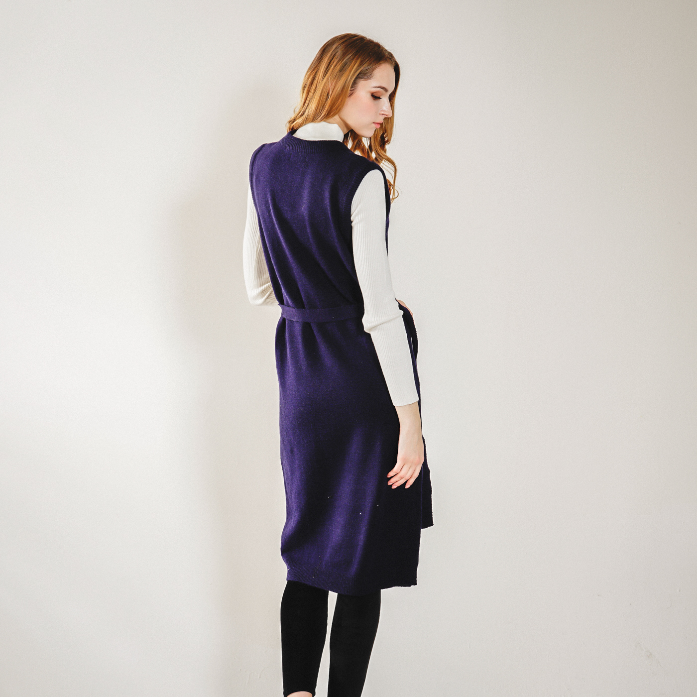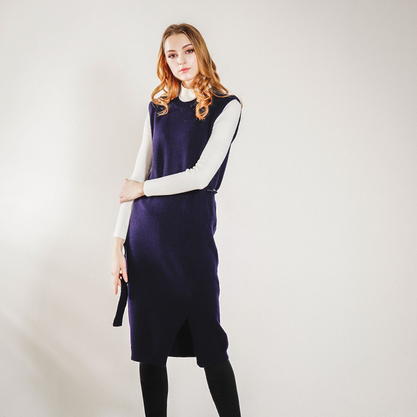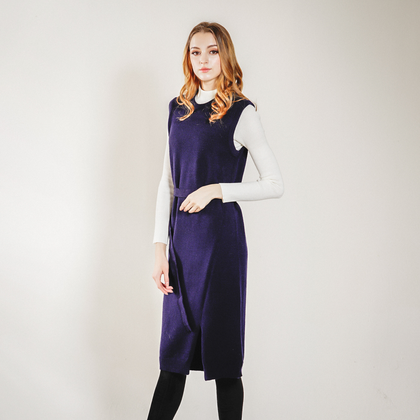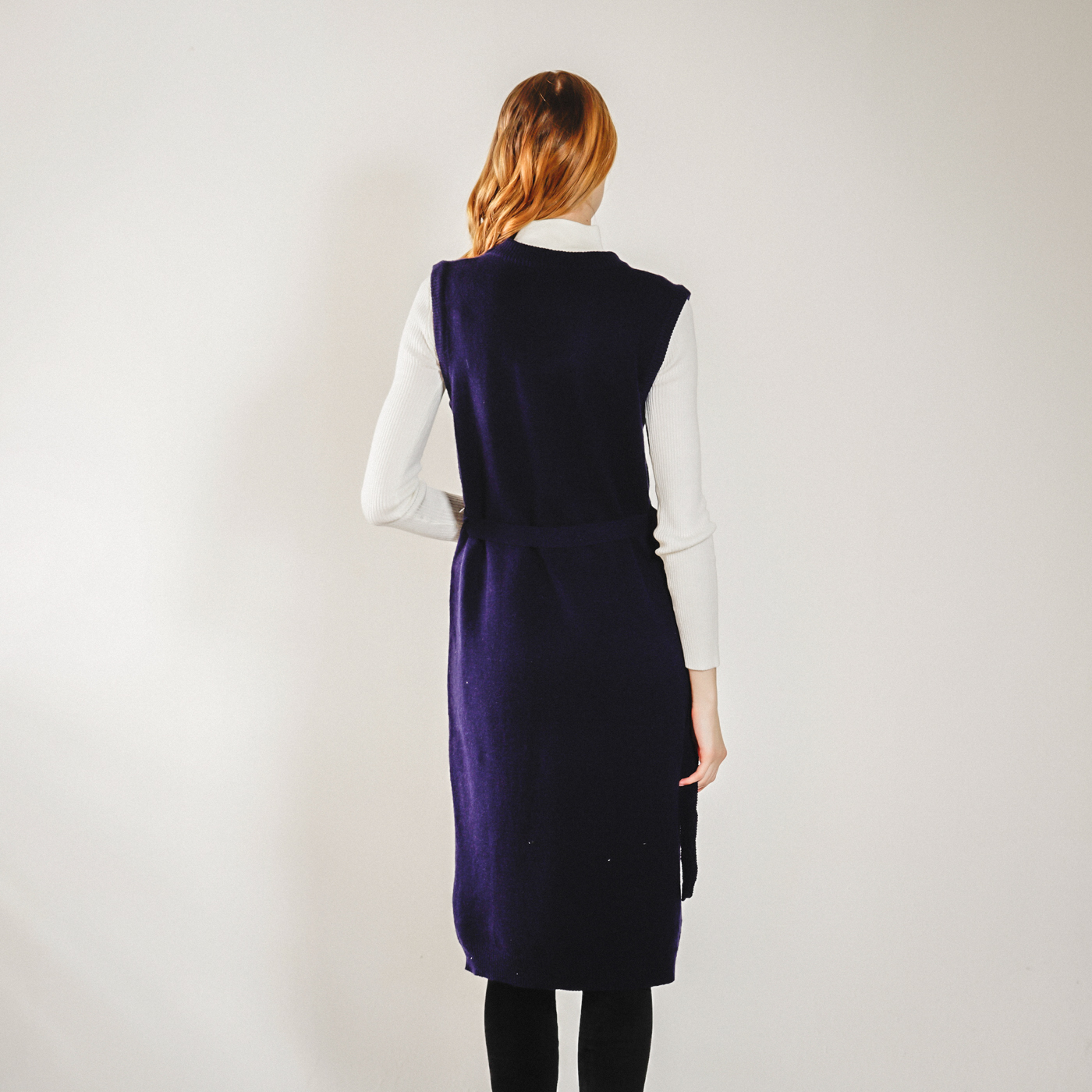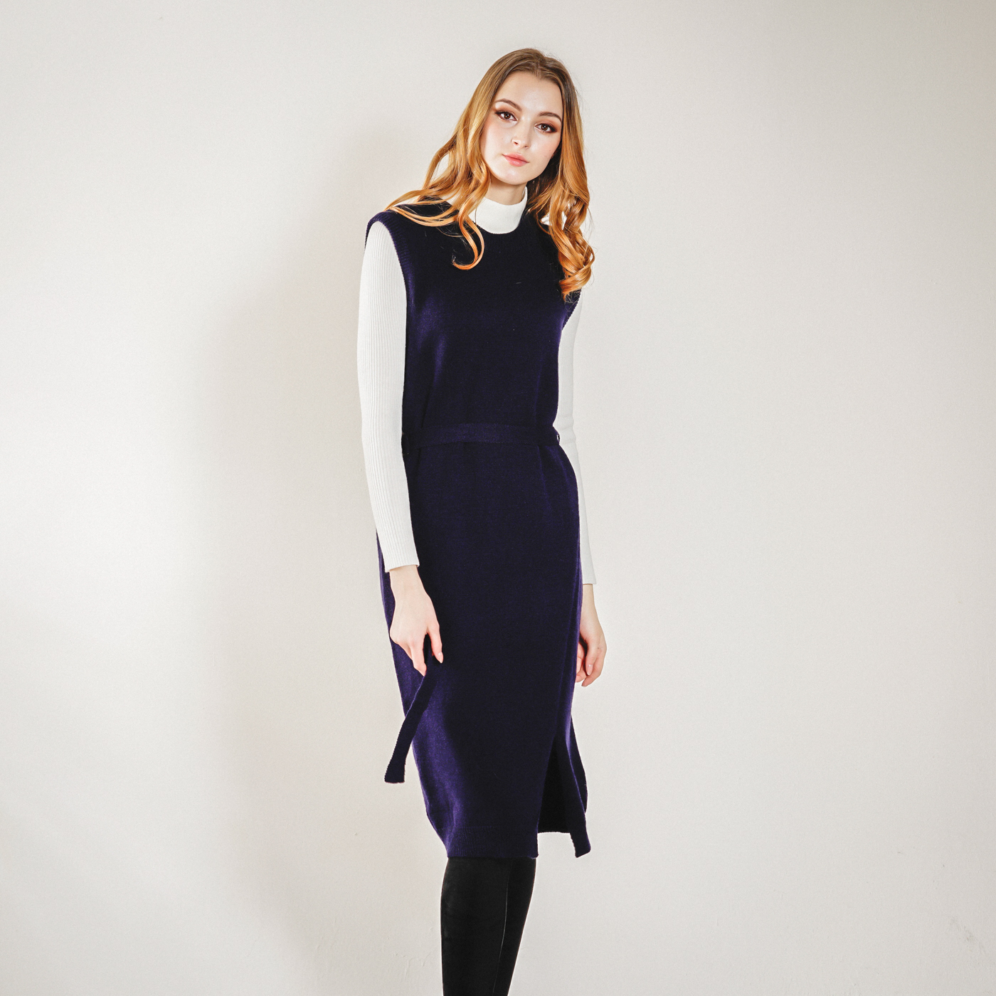 롱기장의 시크한 벨트 포인트의 니트 원피스입니다. 베스트로 코디하셔도 좋습니다.
