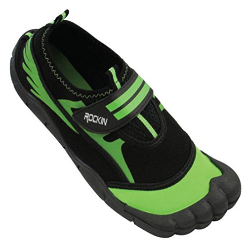 -. Binding : Apparel -. Brand : Rockin Footwear -. Department : womens -. Feature : The amphibious design will protect your toes & feet from sand to surf. / Easy on & off hook and loop closure. / Extra durable traction sole will keep you sturdy and reduce slips. / Breathable mesh panels & Velcro strap. Made of durable rubber for longer lasting. / These run LARGE, order a size down. -. Label : Rockin Footwear -. Manufacturer : Rockin Footwear -. NumberOfItems : 1 -. PackageQuantity : 1 -. ProductGroup : Shoes -. ProductTypeName : SHOES -. Publisher : Rockin Footwear -. Studio : Rockin Footwear -. Title : Rockin Footwear Womens Aqua Foot Water Shoes