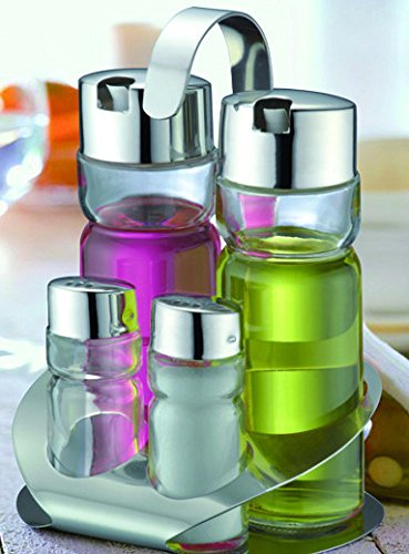 - Feature : Measures 7.5" X 4.7" X 3.9" / Set includes 2 tall cruets and 2 short shakers with a rack / Bottles are made of an attractive combination of stainless steel top and glass body / Comes with a stylish stand to hold the bottles together for easy carrying / A good set to display on the dining tables in homes, restaurants, hotels, resorts, and venues that organize special events