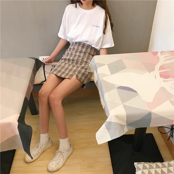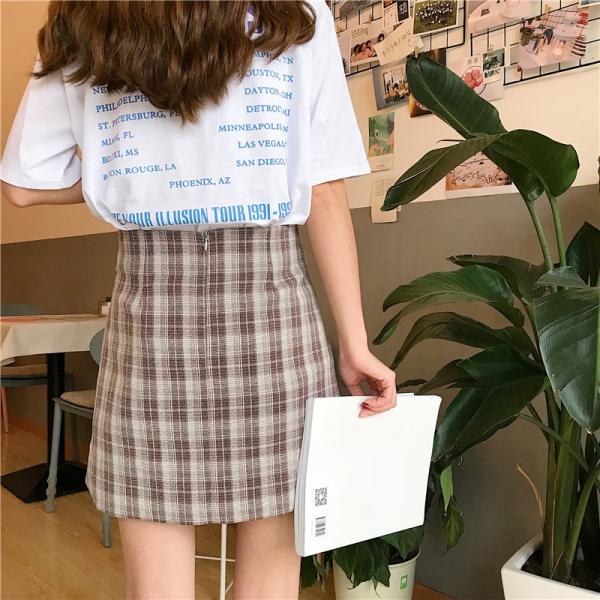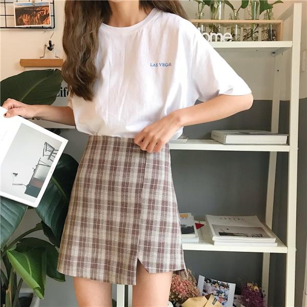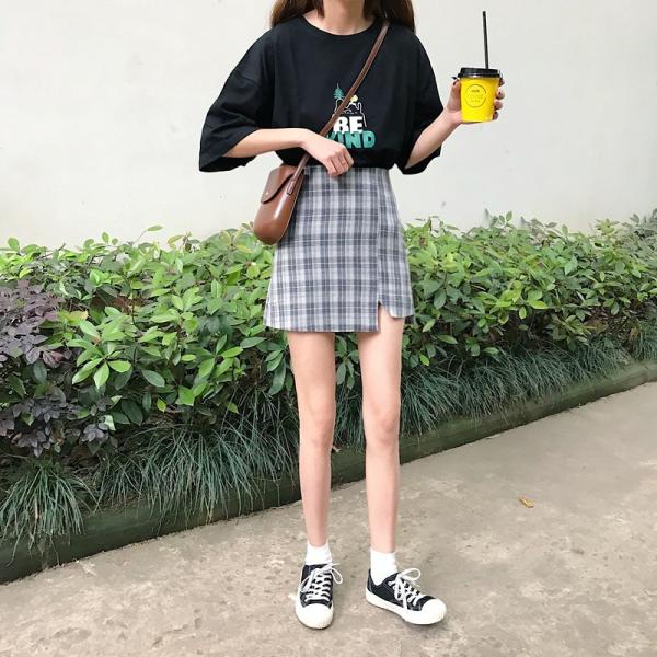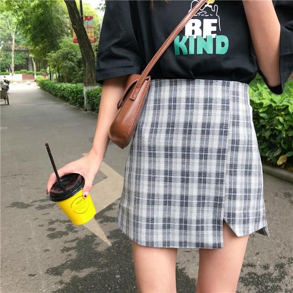 左右非対称デザインのチェック柄ミニスカートです。
