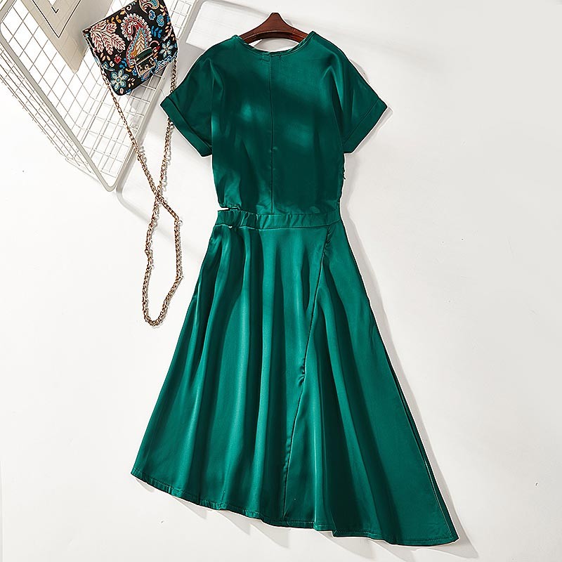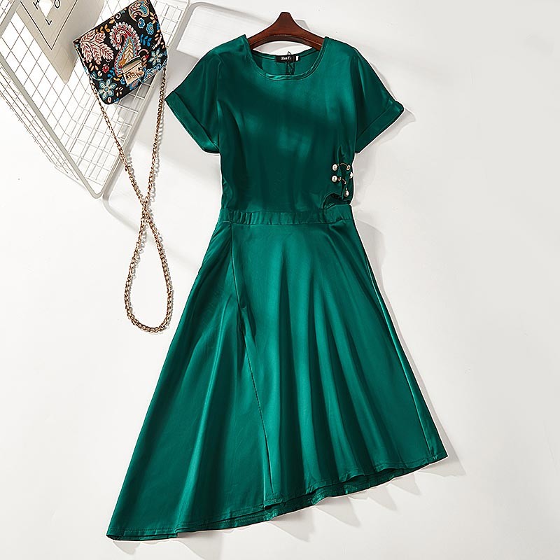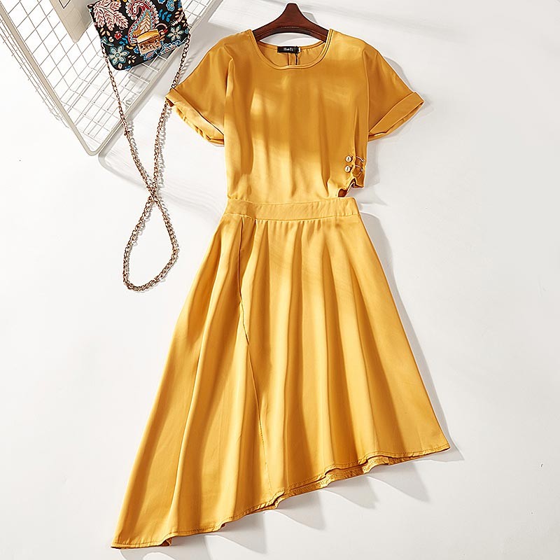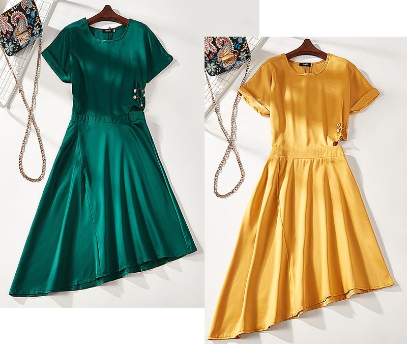 ラウンドネック・半袖・裾が斜めになったアシンメトリーデザインのワンピース♪