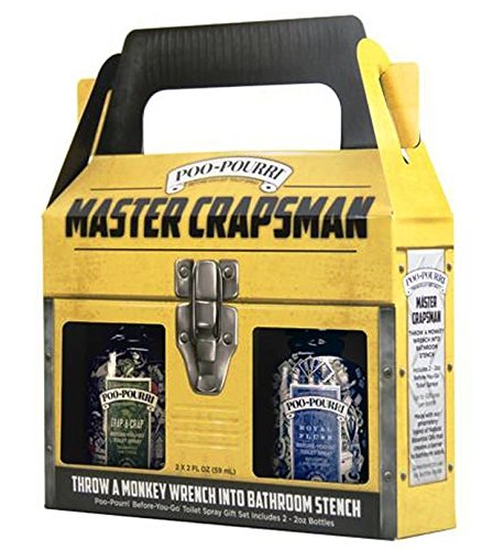 -. Feature : Poo-Pourri "Before You Go" Toilet Spray Gift Set In Tackle Box: ""BEST VALUE"" Contains (1) Master Crapsman Gift Set, Set includes The Poo Pourri Most Exciting Scent , 2 oz. bottle of "Trap-A-Crap" , And 2 oz. bottle of Royal Flush (1) Bonus Free Number 1 in Service ,Hand Sanitizer, and Tissue Pack / Made in the USA / KEEP NASTY SMELLS IN YOUR BOWL: with the "POO POURRI" The "Original" Before-You-Go toilet spray, Creates a layer that traps odors under the surface "POO POURRI" The original Before-You-Go toilet spray that STOPS bathroom odors before they ever begin - **SERIOUSLY!** no more trying to mask odor already in the air **PROACTIVE ODOR PROTECTION: ** " PRE POO TOILET SPRAY " traps odors before they escape, SP.R.Itz the bowl Before-You-Go and NO ONE else will ever know / CONTAINS ESSENTIAL OILS: releasing a fresh fragrance --- leaving the bathroom smelling great Scientifically-tested Formula Made of essential oils and other natural compounds; no harsh chemicals, aerosol, parabens, Phthalates, or formaldehyde; all stink-fighting good stuff / PERFECT FOR ON-THE-GO: Small, convenient, non-aerosol spray bottle is easily portable Over 200 uses in the 4-ounce bottle