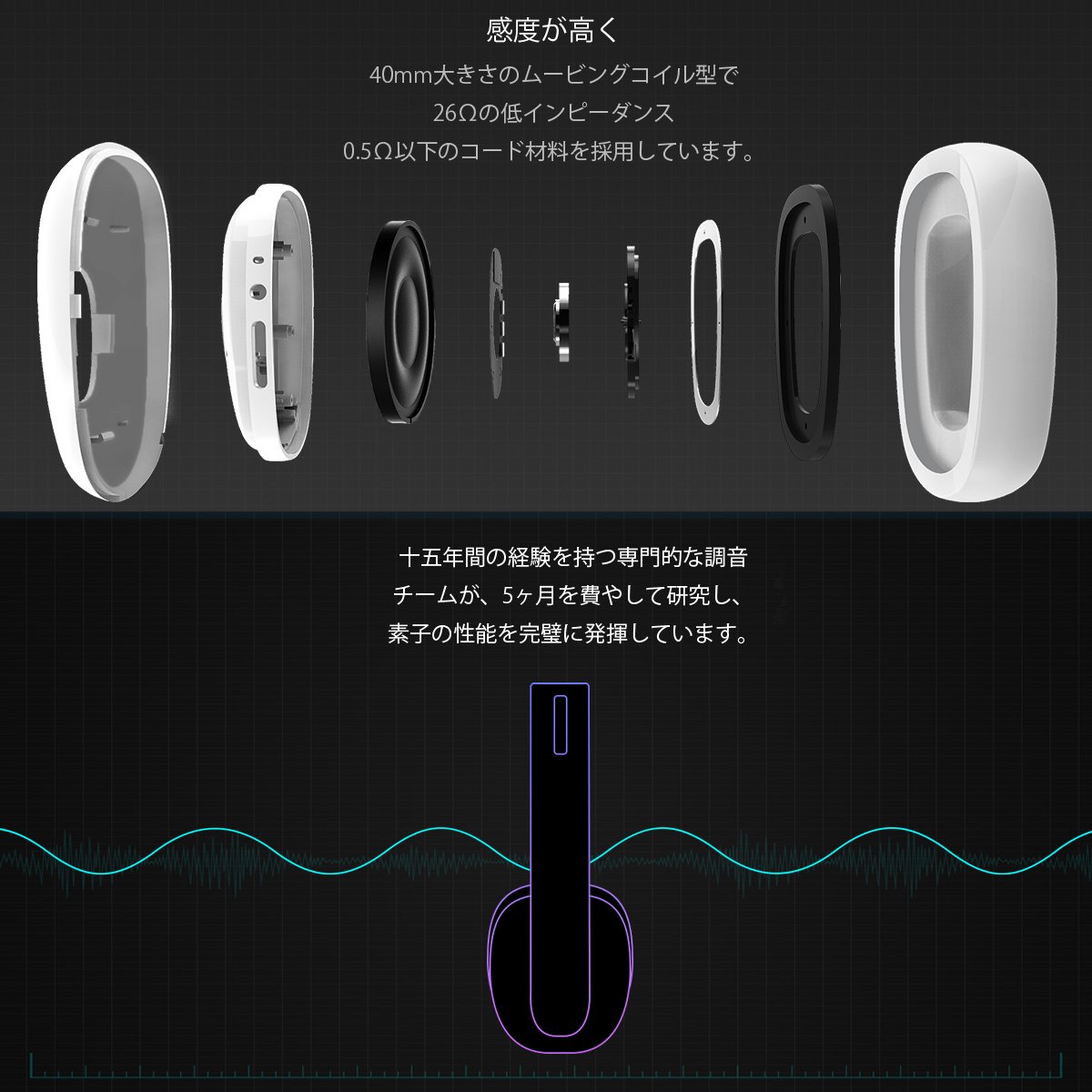 It has a high sensitivity and a moving coil type of 40 mm size, and adopts a low impedance of 26 Ω, a code material of 0.5 Ω or less.