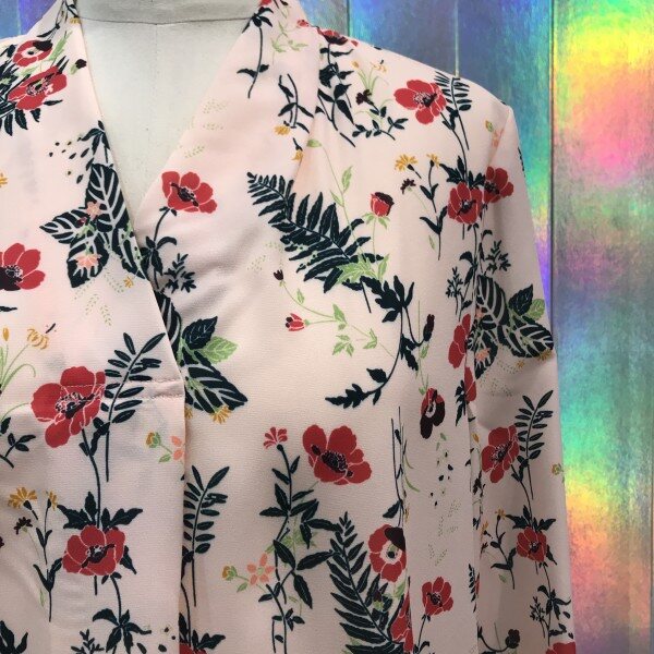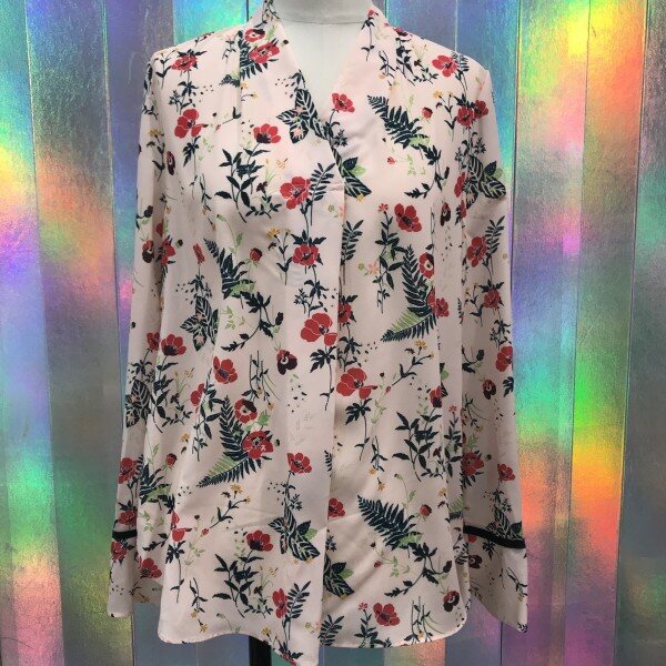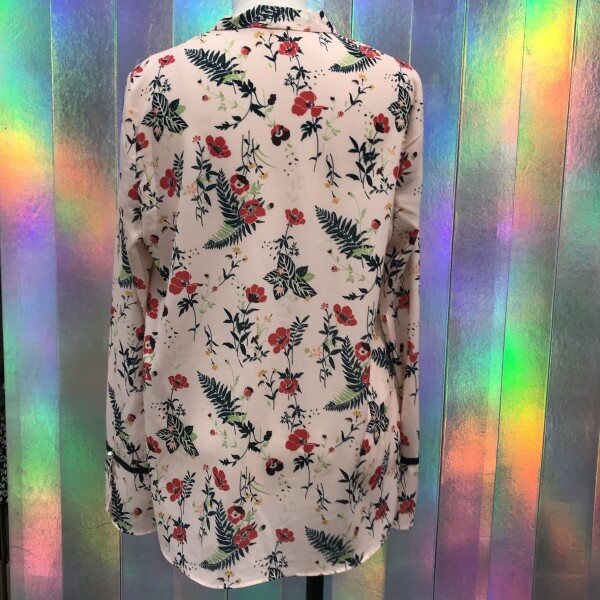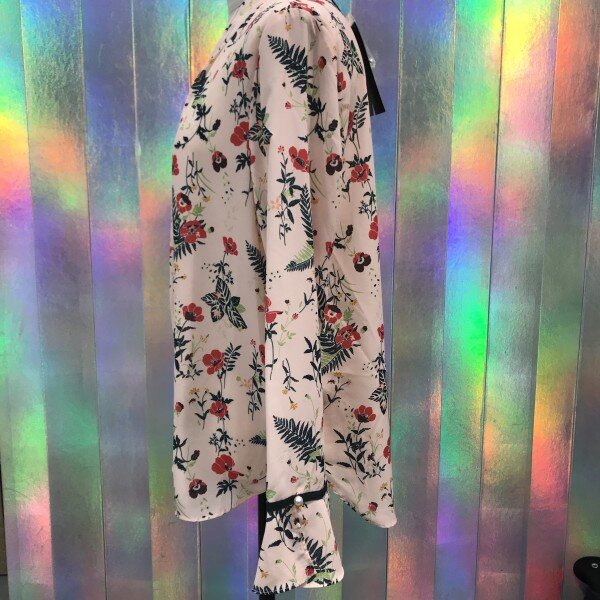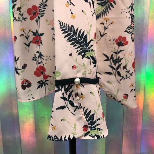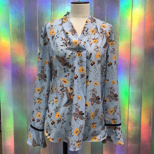 깊은브이넥 라인과 커브스소매가 여성스러운 블라우스입니다