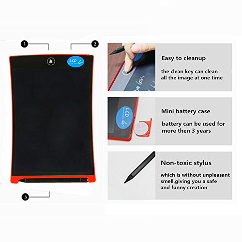 -. Feature : CLEAR KEY,easy to use for all ages,touch of the clear button the image can be erased at one time / ULTRA THIN DESIGN,made from durable plastic materials,width 0.17",so it is portable,resistant scratch, in addition,non-toxic,once you used this lcd writing pad,you will love it / NO NEED TO CHARGE,SEVENCOLOR® original LCD writing tablet using CHLCD flexible LCD screen,has a low energy consumption, built-in battery can be used for more than 2 years,the product itself does not emit light,it is able to show a perfect handwriting writing just rely on the outside light / REWRITEABLE,PAPERLESS,writing like pen on paper,the creation of LCD e-writer replaced the traditional paper,it can save 100000 pieces of paper,it is a great gift for students,teachers, business man,doctors,deaf and dumb person ect. / LCD electronic tablet could also used as a message board,it not only can be placed on the table, desk, but also can be attached to the refrigerator, so leave others a message is very convenient