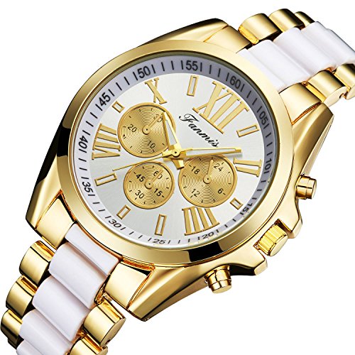 -. Title : Fanmis Unisex Unique Roman Numeral Gold Plated Metal Nylon Link Analog Disply Quartz Watch White