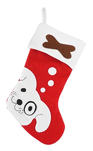 - Features a red stocking with a dog dreaming of a bone with a stitched design & a white cuff